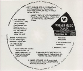 Canada Warner Music Canada promo CD (Warner Music March, 1991) 1. Harriet - Temple Of Love (Tuff Stuff Edit) 3:19 2. Happy Holidays - Step On (1991 Edited Remix) 4:21 3. Todd Rundgren - Change Myself (Edit) 3:56 4. Stress - Flowers In The Rain 4:15 5. Queen - Headlong (Canadian CHR Edit - No Guitar) 3:20 6. Tangier - Stranded 4:15 7. Dinosaur Jr. - The Wagon (Edit) 3:23 8. INXS Profile 18:10 9. INXS Radio Station Liners (6) 0:30 |